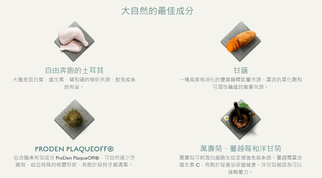 Freshly cooked turkey (30%), chicken jerky (22.5%), sweet potatoes, potatoes, turkey jerky (8%), peas, chanterelle (4%), alfalfa, dried eggs (3%), chicken Juice (1.5%) ), Salmon Oil (1%), Minerals, ProDen PlaqueOff (2,500 mg/kg), Fructooligosaccharides, Peppermint, Parsley, Apple, Carrot, Spinach, Psyllium, Seaweed, Chamomile, Marigold, Cranberry, Anise and Fenugreek.