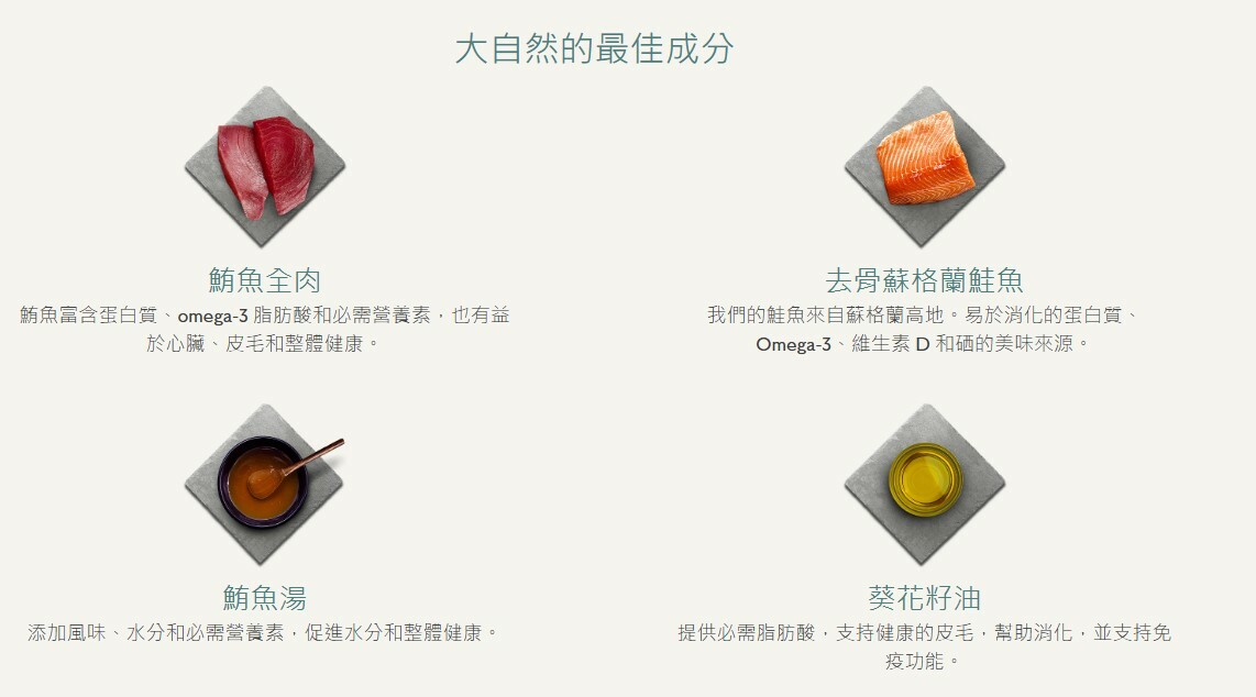 吞拿魚全肉 (58%)、吞拿魚肉湯 (32%)、三文魚 (5%)、增稠劑(木薯粉)、葵花籽油和礦物質。