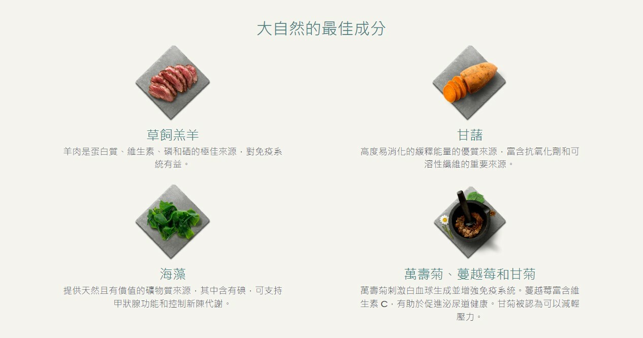 無穀物狗糧採用草地飼養的羔羊和特別挑選的蔬菜和植物精製而成,以符合您的狗的祖先飲食。含有支持消化的益生元,以及用於關節護理的葡萄糖胺和軟骨素。