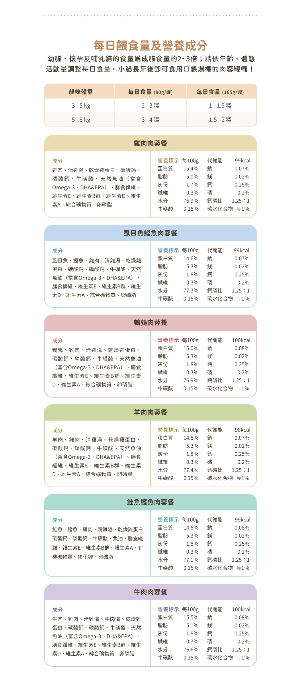 幼貓、懷孕及哺乳貓的食量為成貓食量的2~3倍,可依據年齡、體態、活動量調整每日食量