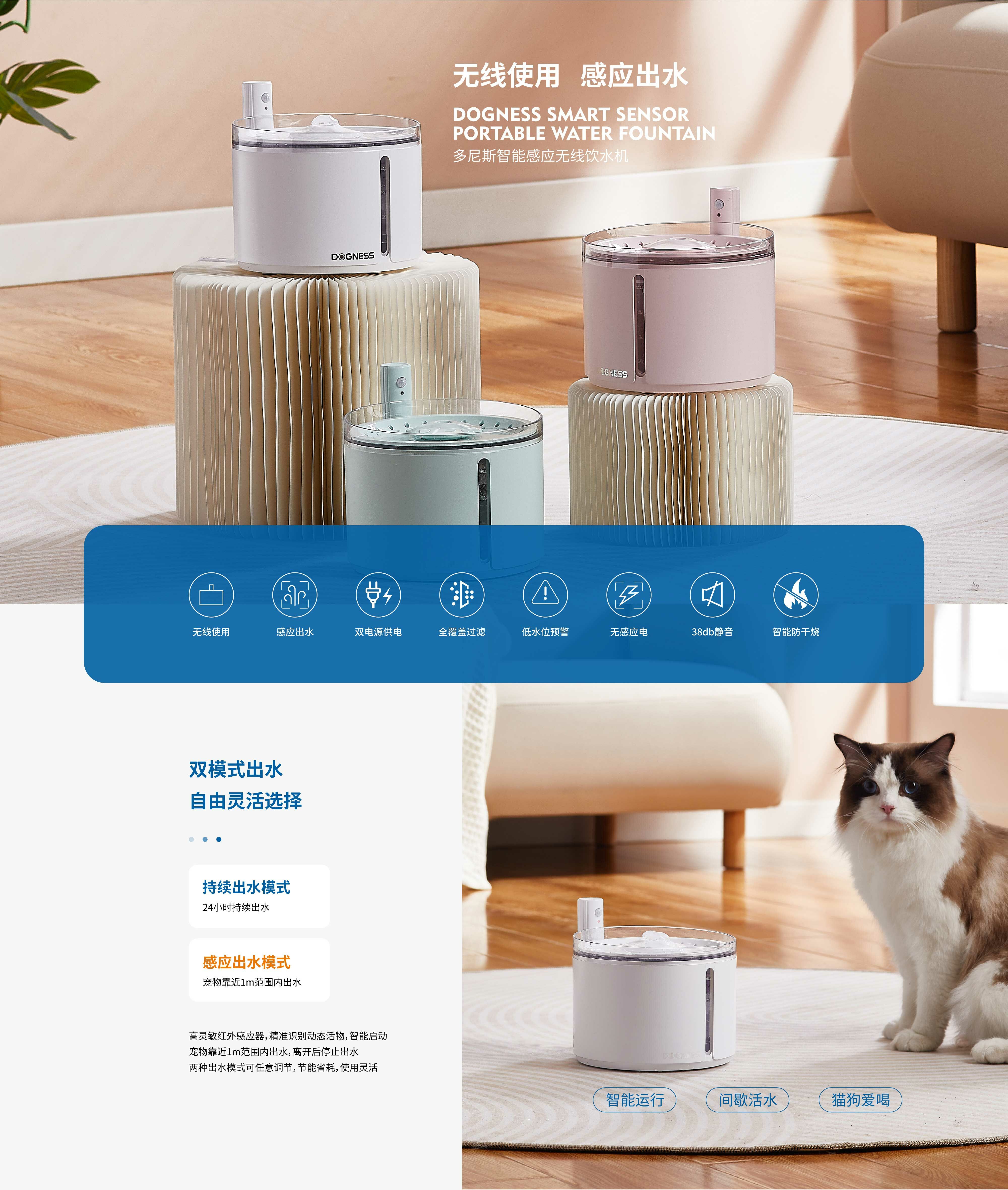 適合犬貓的智慧飲水機,紅外線感應湧泉出水,雙模式可調。搭配無線使用,帶來寵物居家健康飲水最佳方案。
