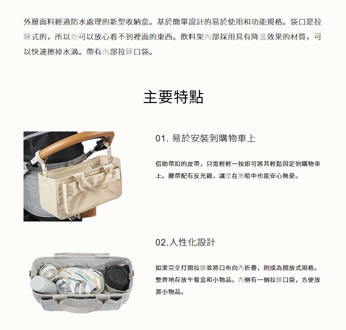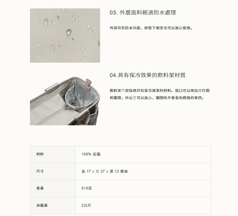外層面料經過防水處理的新型收納盒。基於簡單設計的易於使用和功能規格。袋口是拉鍊式的,所以你可以放心看不到裡面的東西。飲料架內部採用具有降溫效果的材質,可以快速擦掉水滴。帶有內部拉鍊口袋。