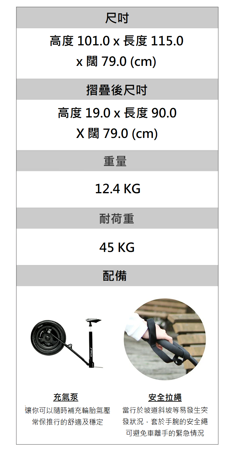 搭配全自行車結構的車體及陪林充氣式輪胎
