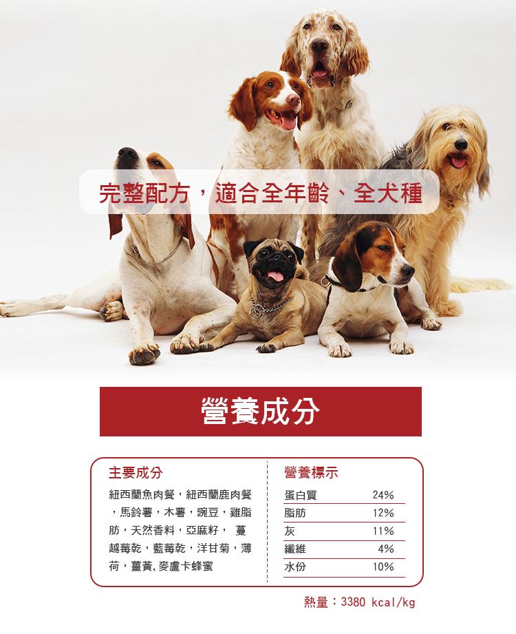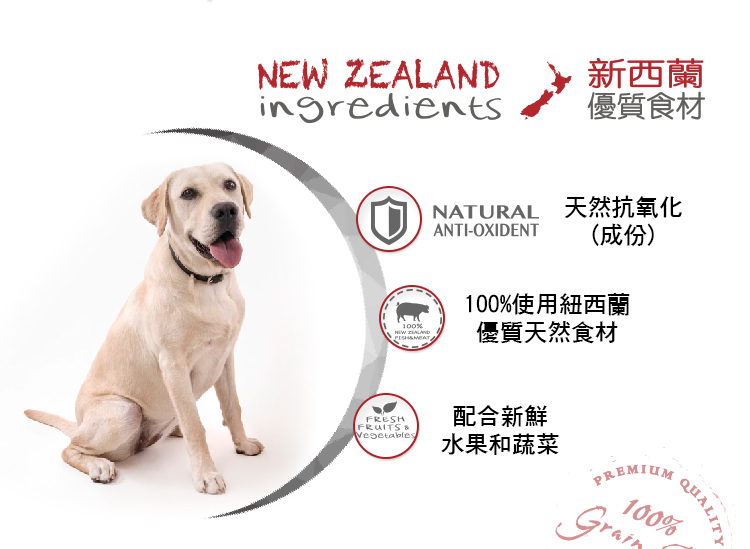 60%紐西蘭魚肉及鹿肉 / 20%新鮮蔬果及蔬菜 / 0%不含穀物成份