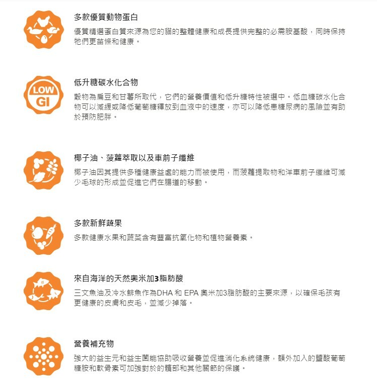 適合所有成長階段和所有品種的貓隻之低脂肪配方,無穀物 火雞、雞、鴨 室內貓配方特別適合室內貓和仍然需要無穀物飲食的不太活躍的貓。