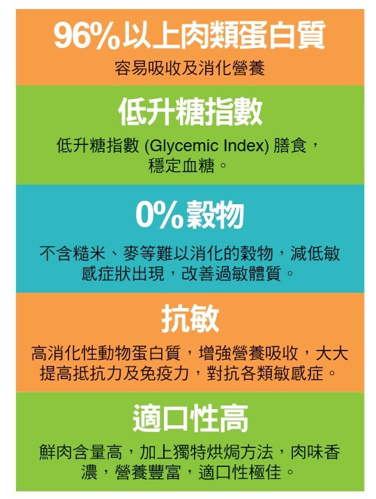 抗敏精煉無穀物鴨肉。加拿大新鮮鴨肉配上健康豆類,添加腸道益菌及葡萄糖胺同時護腸、補關節。精煉配方剔除致敏材料,不含薯仔減低肥胖及敏感症狀。高達97%動物蛋白質,激發食慾!