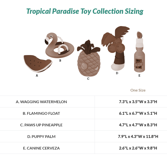 用我們的 Tropical Paradise Plush 夏季狗玩具系列向夏天問好,專為在陽光下玩樂而設計!當您的愛犬發現我們的菠蘿中隱藏的切片時,它們會為我們美味的棕櫚樹吃椰子,並享受甜蜜的勝利。海灘上的生活更美好,所以讓您的幼犬抓緊時間用我們的啤酒瓶狗玩具啜飲犬類 cerveza,或者被運送到池畔到一個充滿西瓜吱吱聲和火烈鳥夢想的天堂。現在,有了這些夢幻般的熱帶狗玩具,您的幼犬可以一整年都過著夏日的心情!