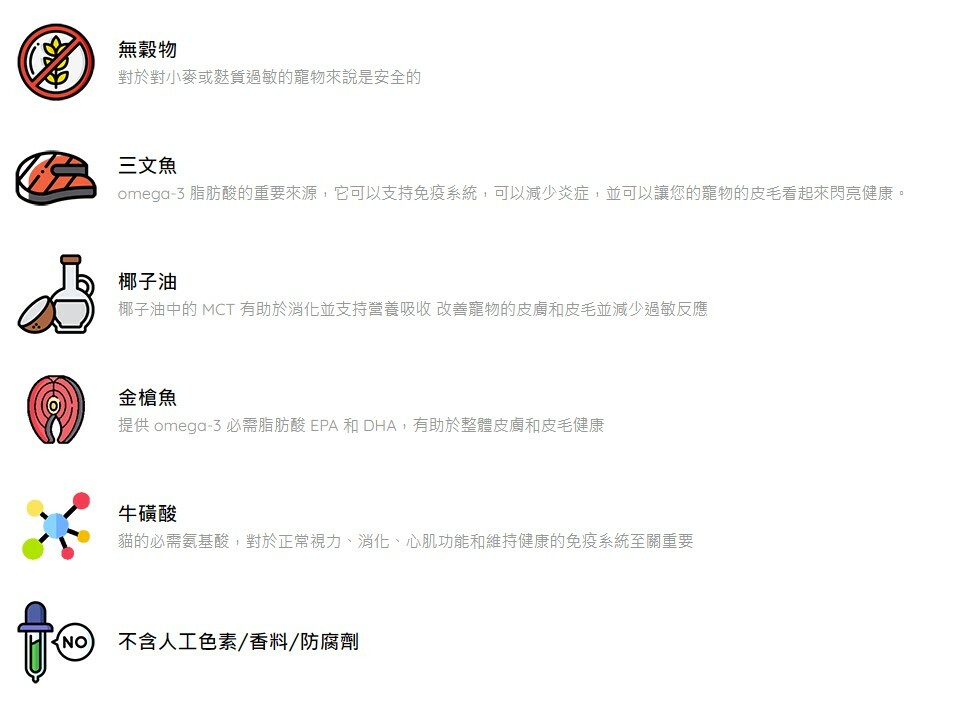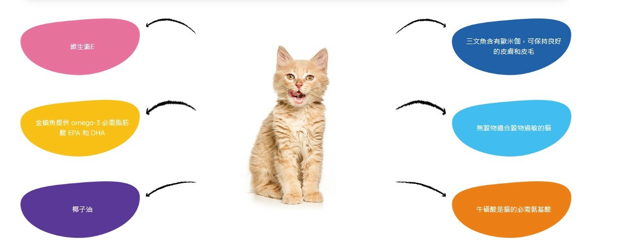 雞肉、金槍魚、鮭魚、葵花籽油、膠凝劑、氨基酸、著色劑、維生素和礦物質、鮭魚原油、椰子油、牛磺酸。