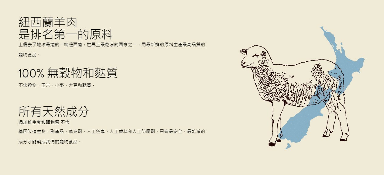 成份:羊肉、羊肉粉、海洋魚粉、青豌豆、木薯粉、馬鈴薯、黃豌豆、雞油、亞麻籽、啤酒乾酵母、天然香料、天然緩衝醋、海鹽、魚油、蔓越莓乾、藍莓乾、薑黃、洋甘菊、薄荷、氯化鉀、硫酸鎂、氯化膽鹼、牛磺酸、DL-蛋氨酸、碳酸鈣、胺基酸複合鋅、胺基酸複合鐵、維生素E 補充劑、菸鹼酸(維生素B3)、胺基酸複合銅、d-泛酸鈣(維生素B5)、胺基酸複合錳、亞硒酸鈉、核黃素補充劑、單硝酸硫胺素(維生素B1)、維生素B12 補充劑、維生素A 補充劑、鹽酸吡哆醇(維生素B6)、硫酸鈷、碘酸鈣、葉酸、維生素D3 補充劑, 增加新鮮感的混合生育酚、迷迭香萃取、茶萃取、留蘭香萃取物。