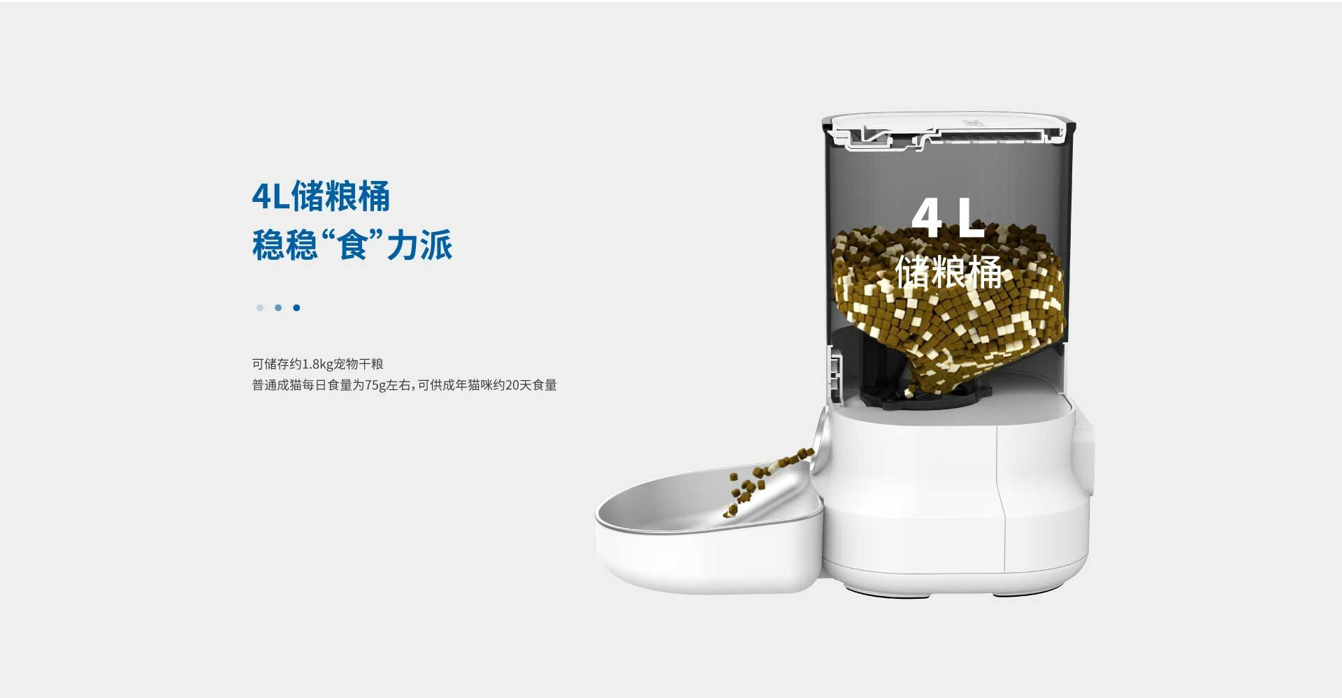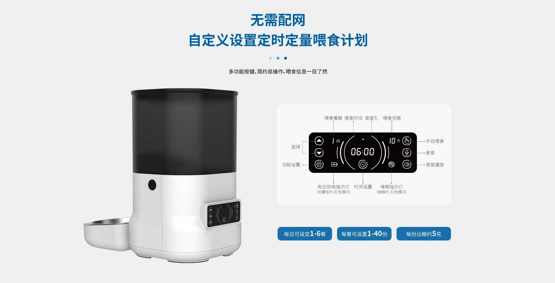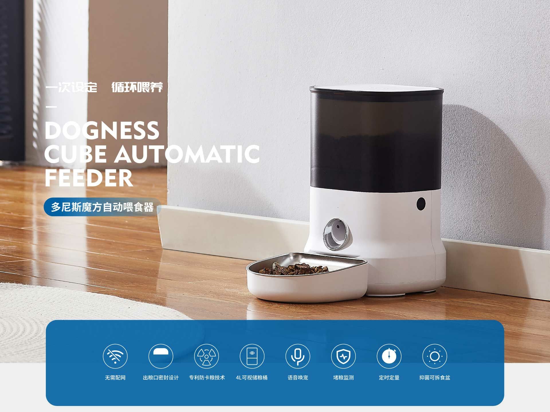 無需配網,通電即用。透過設定餵食器表面的操作面板,進行定時定量的餵食計畫。 造型時尚簡約,犬貓適用。